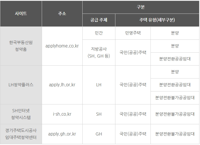 주택유형과 사업주체에 따라 접수 사이트가 다르지만, 청약홈 이외의 곳에서 청약 접수를 하더라도 분양주택과 분양전환공공임대주택의 당첨자 선정은 청약홈을 통해 진행됩니다.