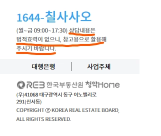 상담 내용은 법적인 효력이 없으므로, 상담 내용을 바탕으로 청약 신청을 잘못하거나 부적격 판정을 받았을 경우 본인의 책임이라는 점을 꼭 기억하세요.